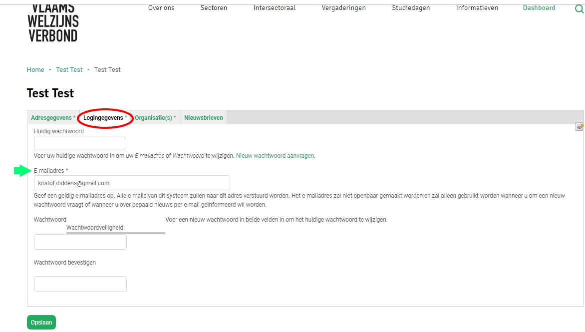 Op het tabblad Logingegevens vindt u het mailadres en wachtwoord terug. Mailadres is tevens uw login; dus indien dit wijzigt, dient u nadien ook met het nieuwe mailadres in te loggen!